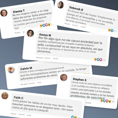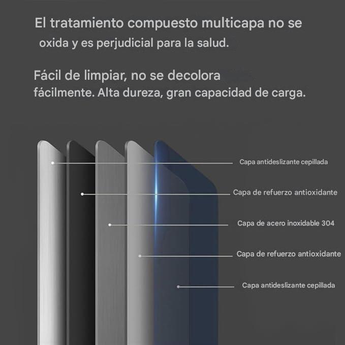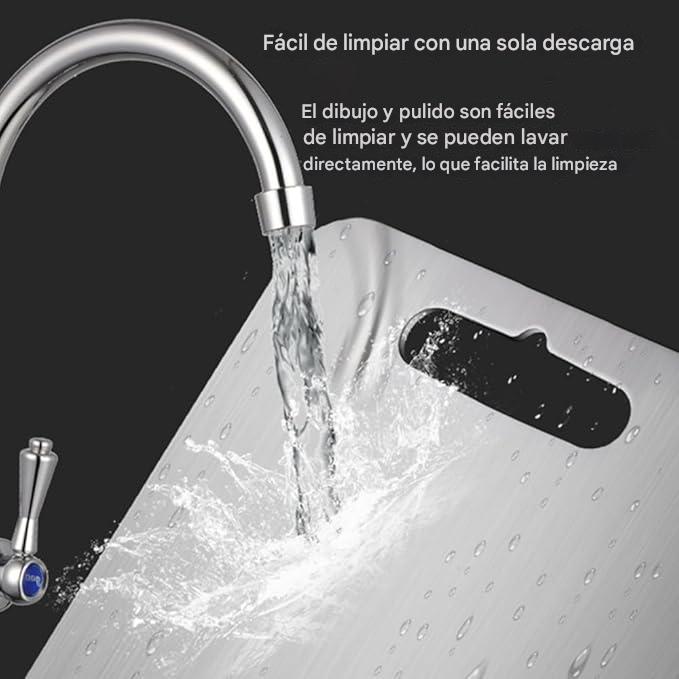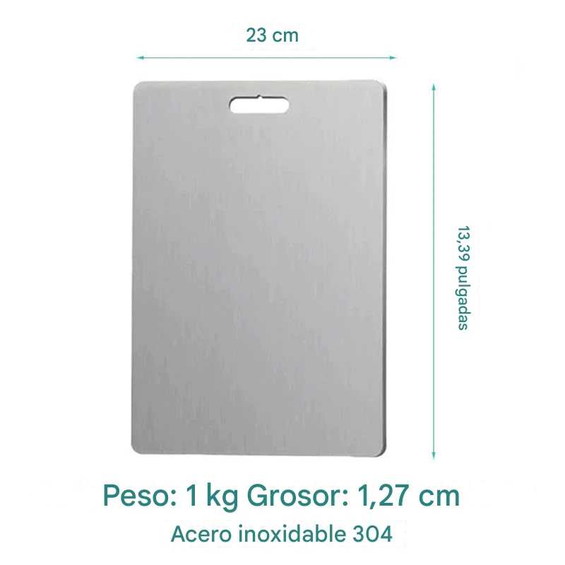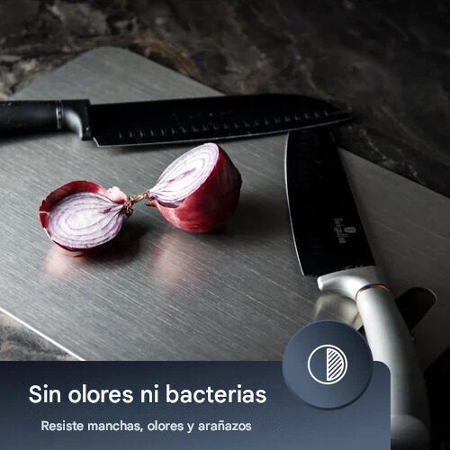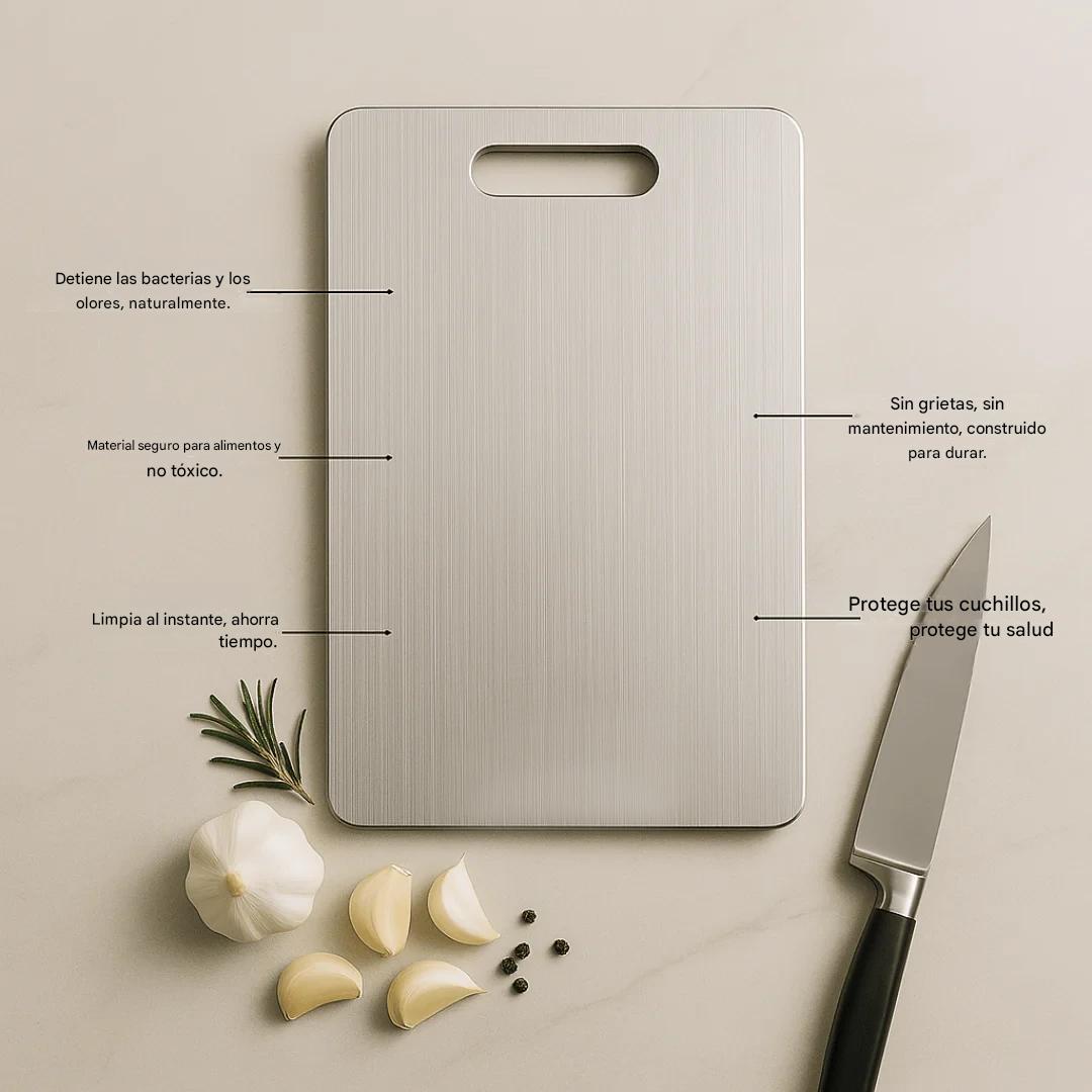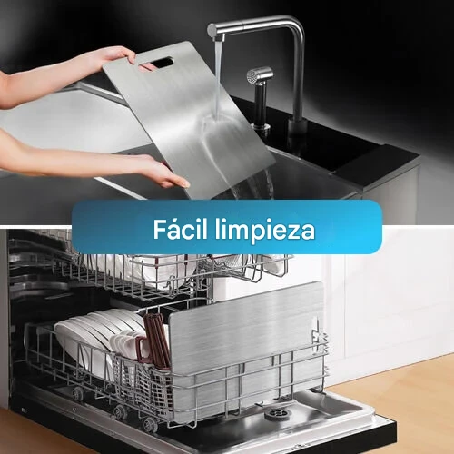 ¡Queda genial en la cocina! Es resistente y antideslizante, ha eliminado ese molesto ruido metálico y es facilísima de limpiar. Ya he tirado mi vieja tabla de cortar de plástico y estoy feliz de no tener que lidiar ya con arañazos de plástico ni con la acumulación de bacterias.